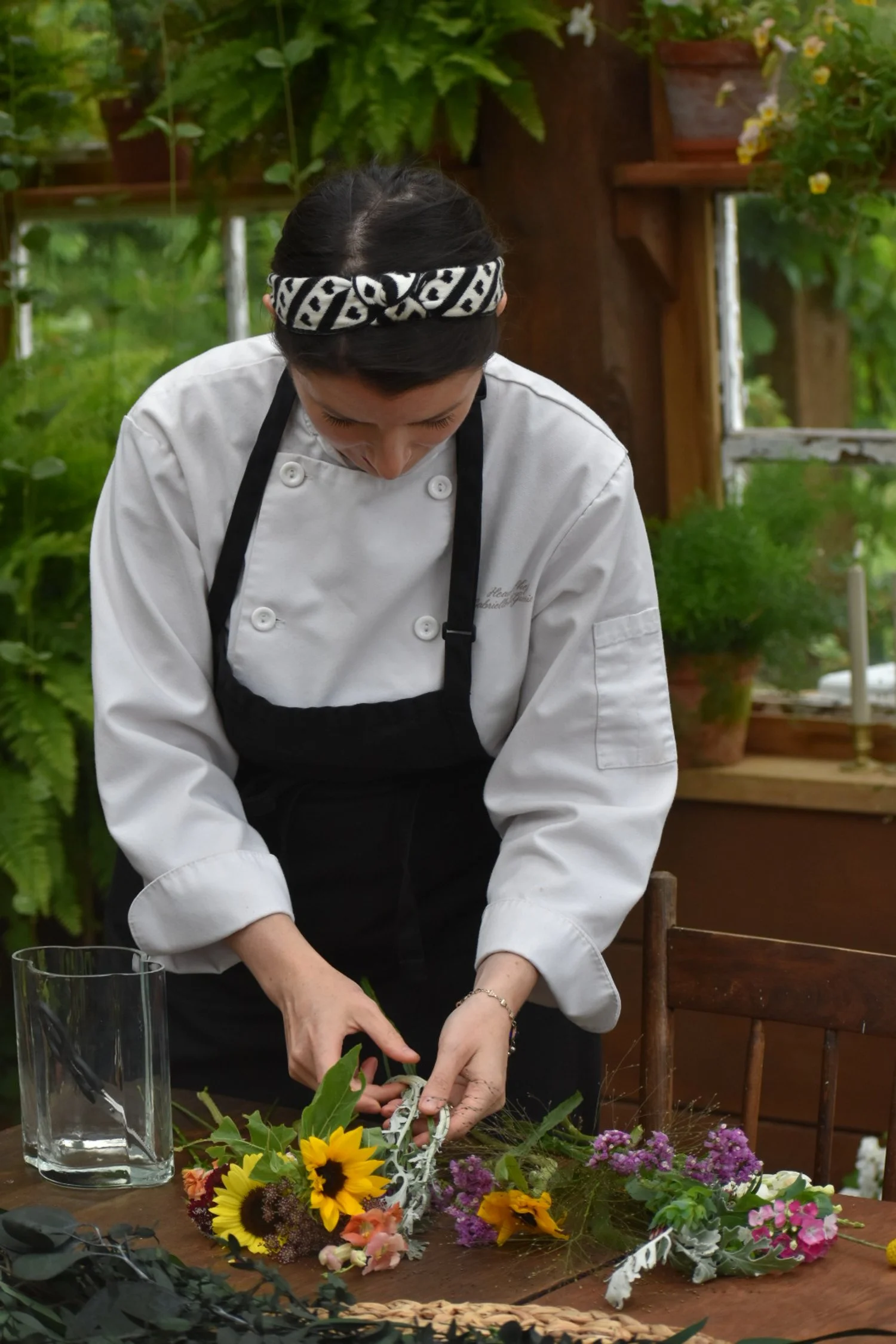 Le « Greenhouse » est un espace magique, rêvé dans le centre d’un jardin en plein épanouissement entouré de champs bucoliques. À l’intérieur, la table vintage en bois est festonnée de fleurs, de chandelles et de verres chics en cristaux. Les invités sont conviés au dévoilement du menu alléchant, « Strawberry Sessions ». Dehors, LeGuerrier sert les pétoncles sur une petite table pliante et y appose les quelques petites touches finales; pétales citronnés de zucchini accompagnées d’ail haché et d’huile de basilic gazon-vert surmonté d’une tuile délicate couleur corail. Jongler avec tant d’ingrédients et de composantes entre la cuisine Airbnb et dresser les assiettes à l’extérieur de la Greenhouse n’est pas chose facile, mais peu semble ébranler cette cheffe. « J’ai appris comment m’organiser pour offrir des services plus facilement en cuisinant pour la famille royale. On doit prioriser dans ce contexte, déterminer ce qui peut être fait à l’avance et ce qui peut être complété ‘sur la minute’, étape de travail banale au premier abord, mais qui ne l’est vraiment pas. Les chefs cuisiniers avec qui j’ai travaillé étaient organisés pour un service à deux comme ils l’étaient pour des services pour 1,500 invités, ce qui m’a sans doute marqué. Plus que jamais, je suis indépendante dans la cuisine et peux m’occuper de nombreuses personnes avec confiance », dit LeGuerrier.